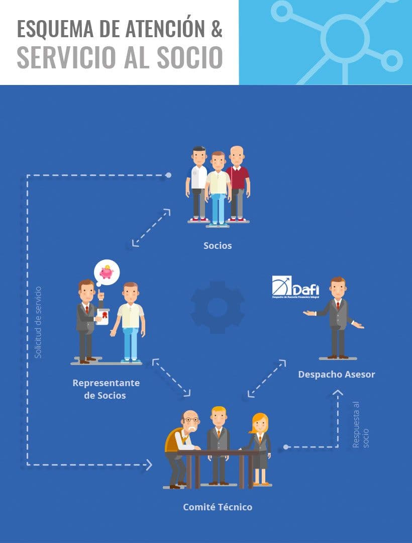 Diagrama servicio al socio,El socio,Representante de socios,Integrante de comité técnico,Órganos de gobierno y administración,Glosario